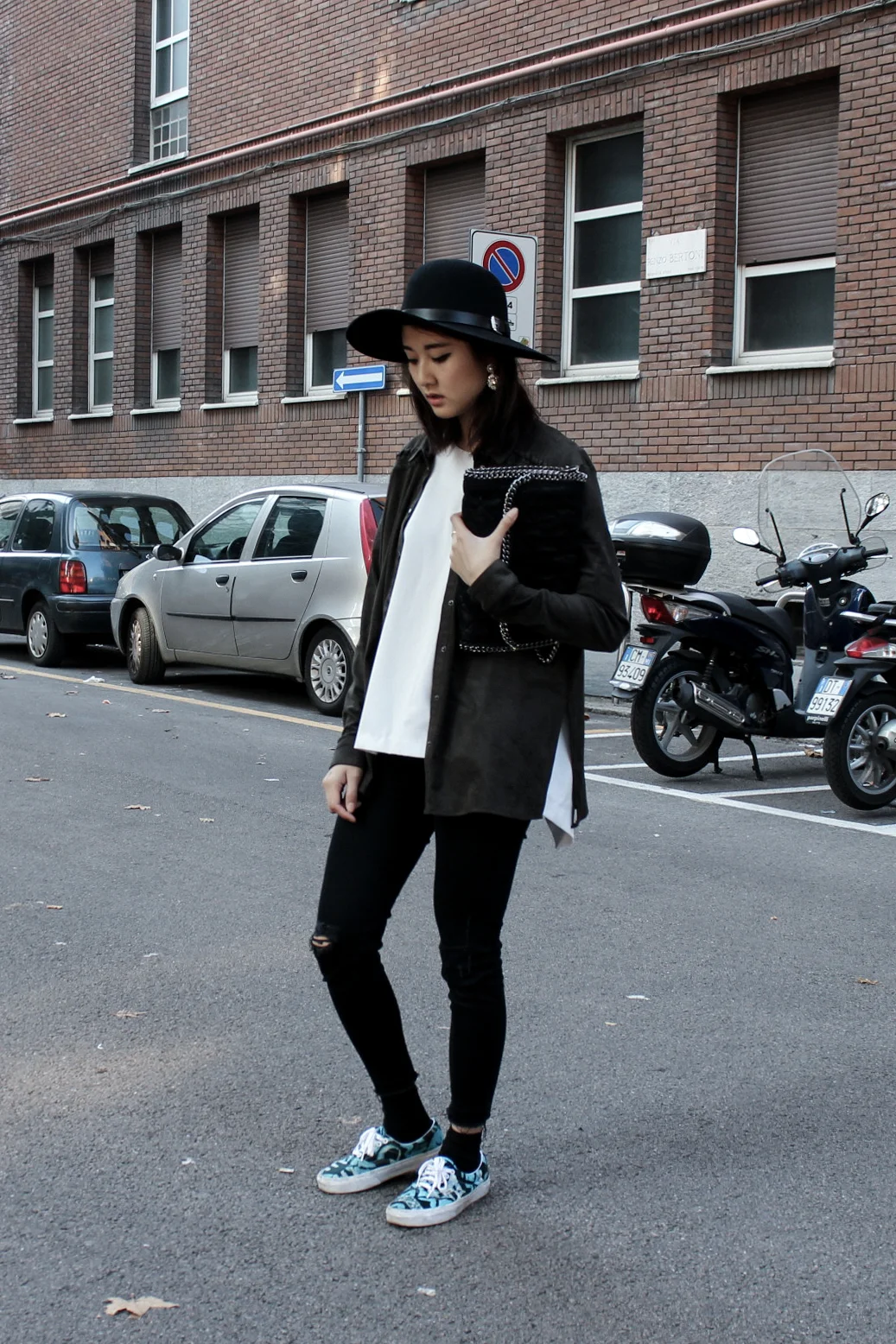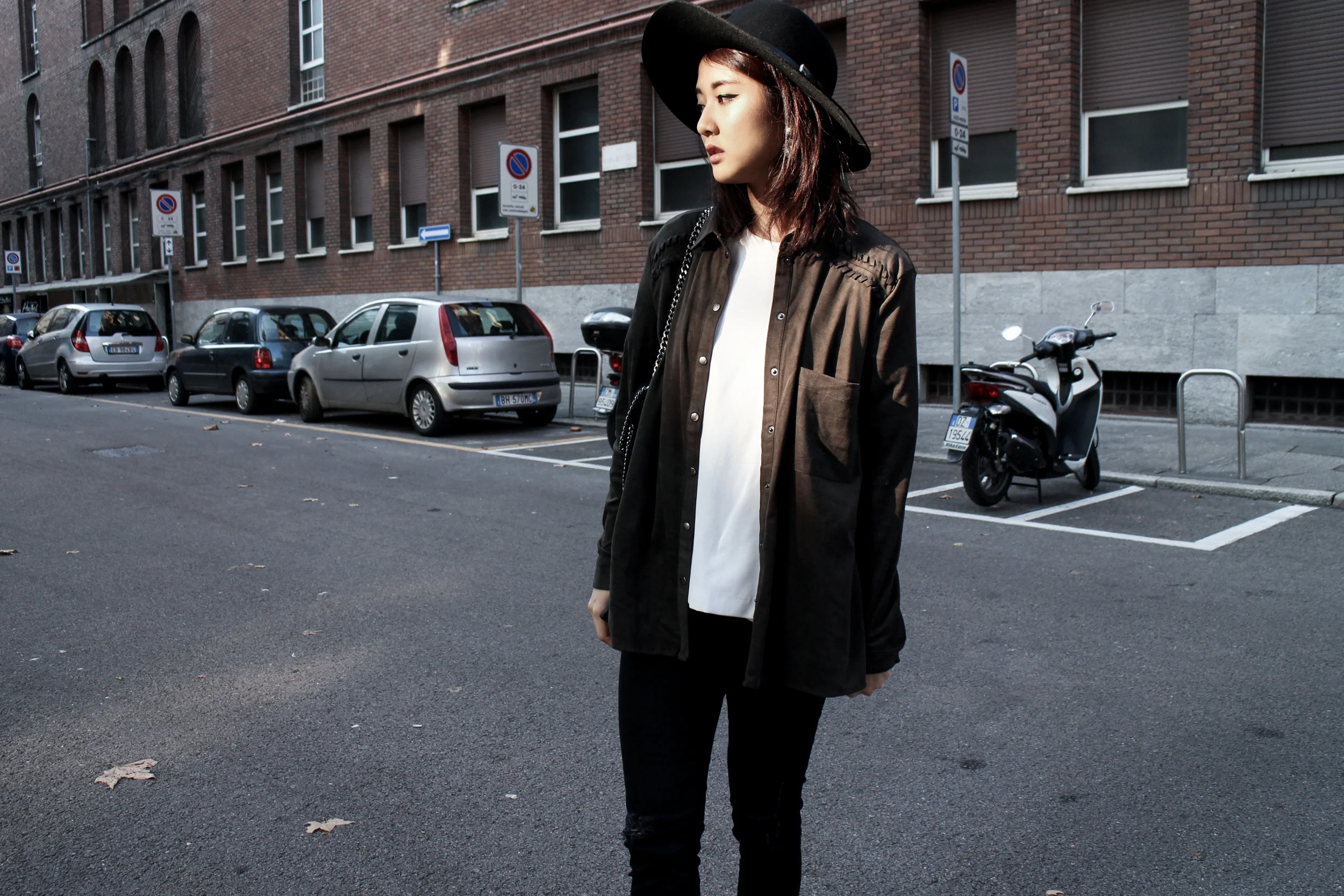 I bought this Suede shirt from Bershka, a store I usually never go into, but when in Milan, you know. Anyway, I went in without much hope, but then I saw this military green suede shirt and it was instant love. It was really very very affordable (24 Euro), and the quality looked great, so I had to go for it. I love suede and I love olive green colours.