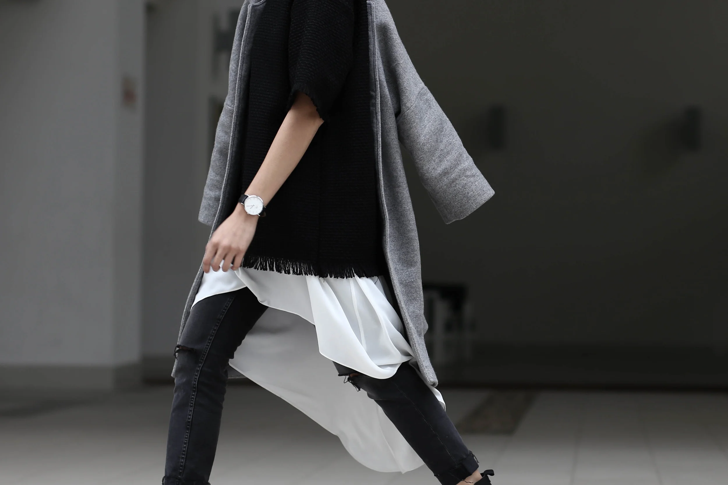 Any outfit below two pieces of clothing is not really me. I don't even know why layering is such an essential part of my style. Maybe because I grew up not exactly skinny and didn't want to wear anything too tight, so I went for oversize pieces most of the time. And it's also really fun to me to mix my clothes of different length so that they make sense in an outfit. Anyway, a layered outfit is so me. I know girls who feel most comfortable in a tight dress, and I feel most comfortable in a pair of skinny jeans, a large and long top and a layer of outerwear outside, preferably a classic like this Subtle & Simple Cocoon Coat. The cut is very classic and minimal, and I wanted to spice things up by wearing a long fish tail dress below my top by LiiQ Rush. Super minimal clean is not 100% me either : )