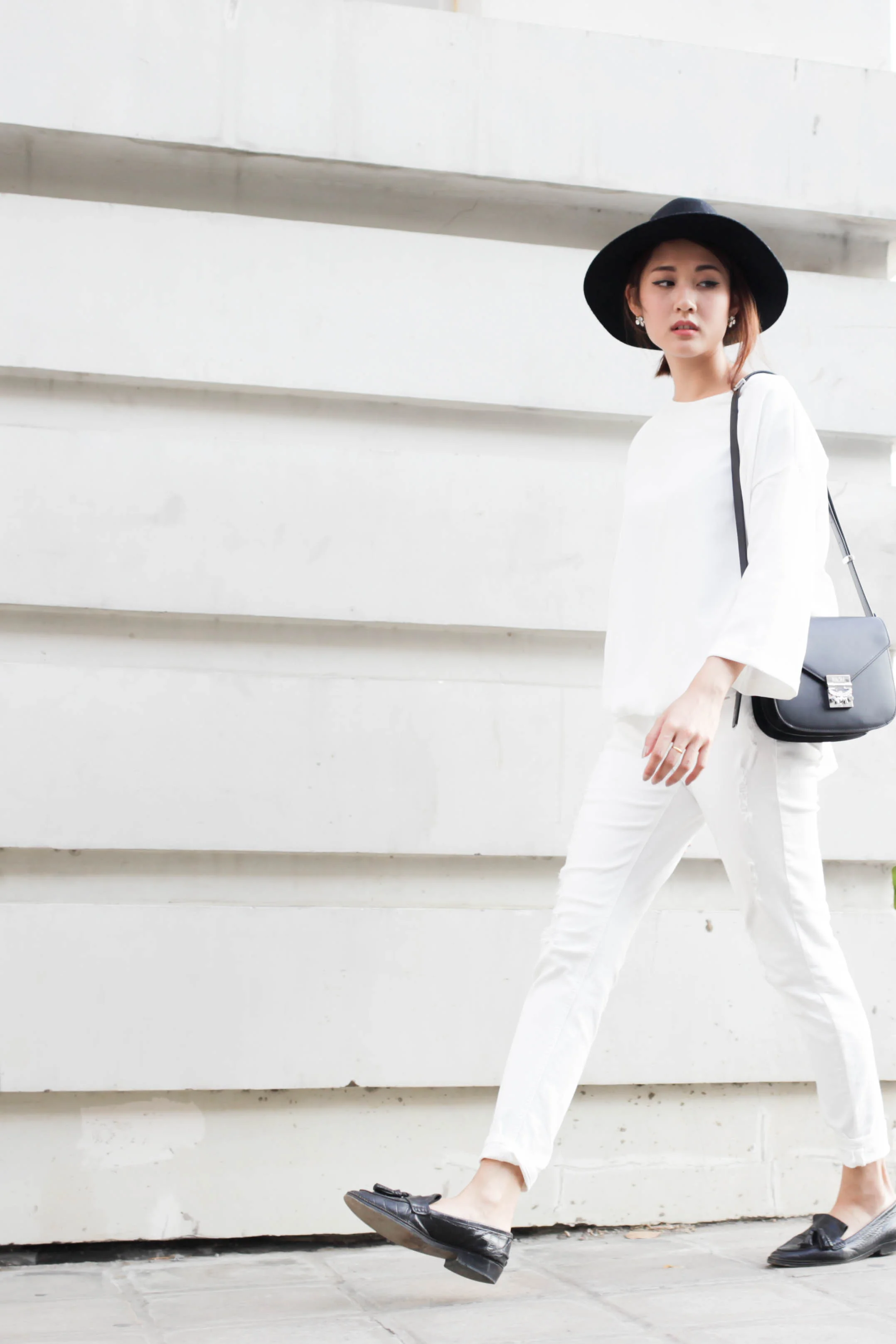 Hat - from China / Top - from Seoul / Bag - MCM Patricia / Pants - Mango VNXK bought at Saigon Square / Loafers - The Kooples / Earrings - Floralpunk Ladybird