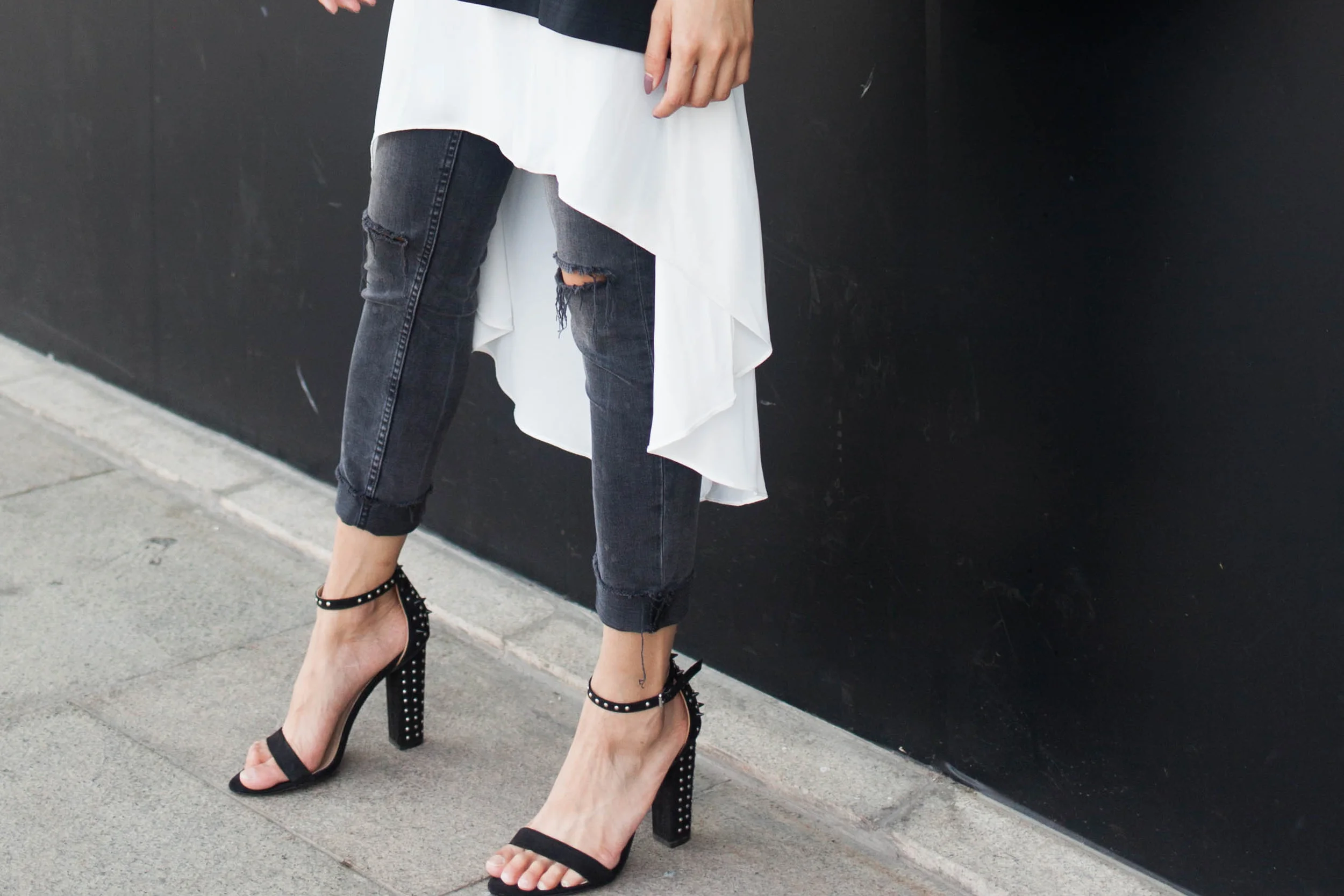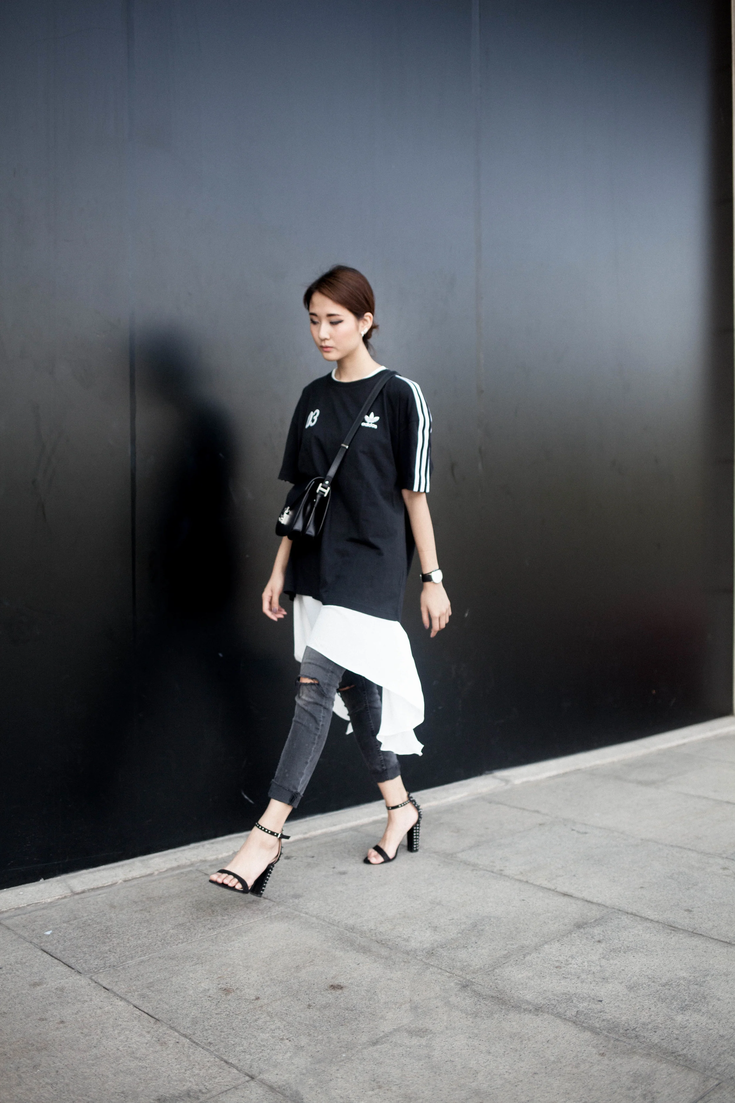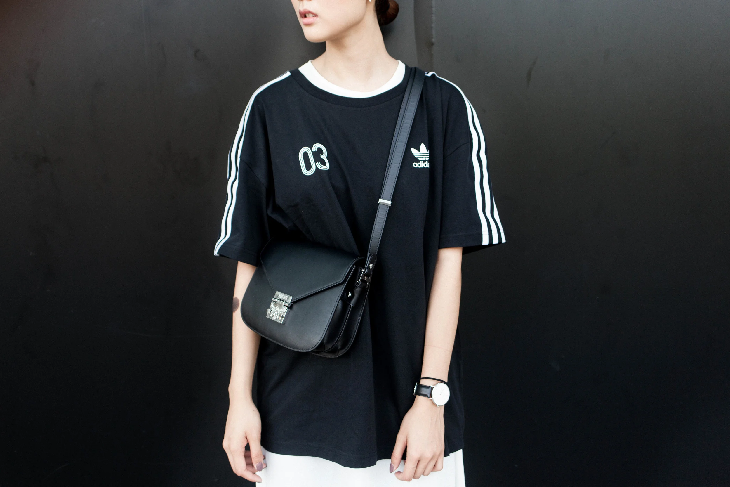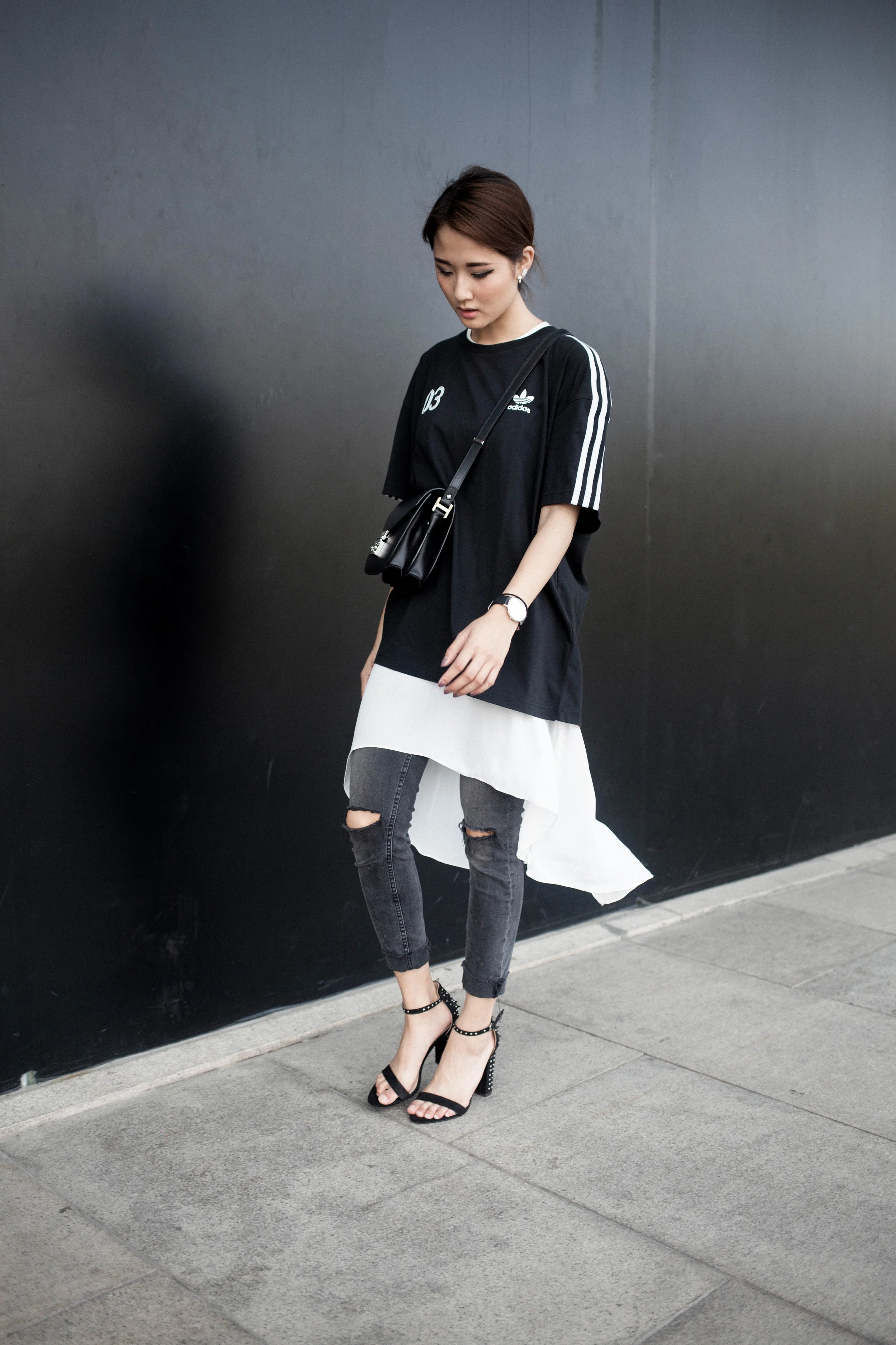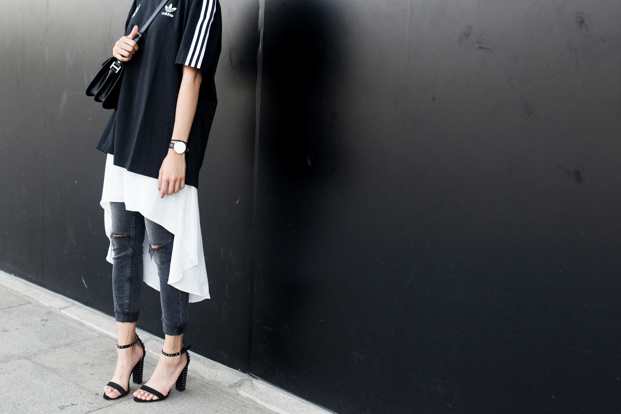 Top - Adidas Originals / White fish tail top - LiiQ Rush / Skinny Jeans, Heels - Zara / Bag - MCM / Watch - Daniel Wellington