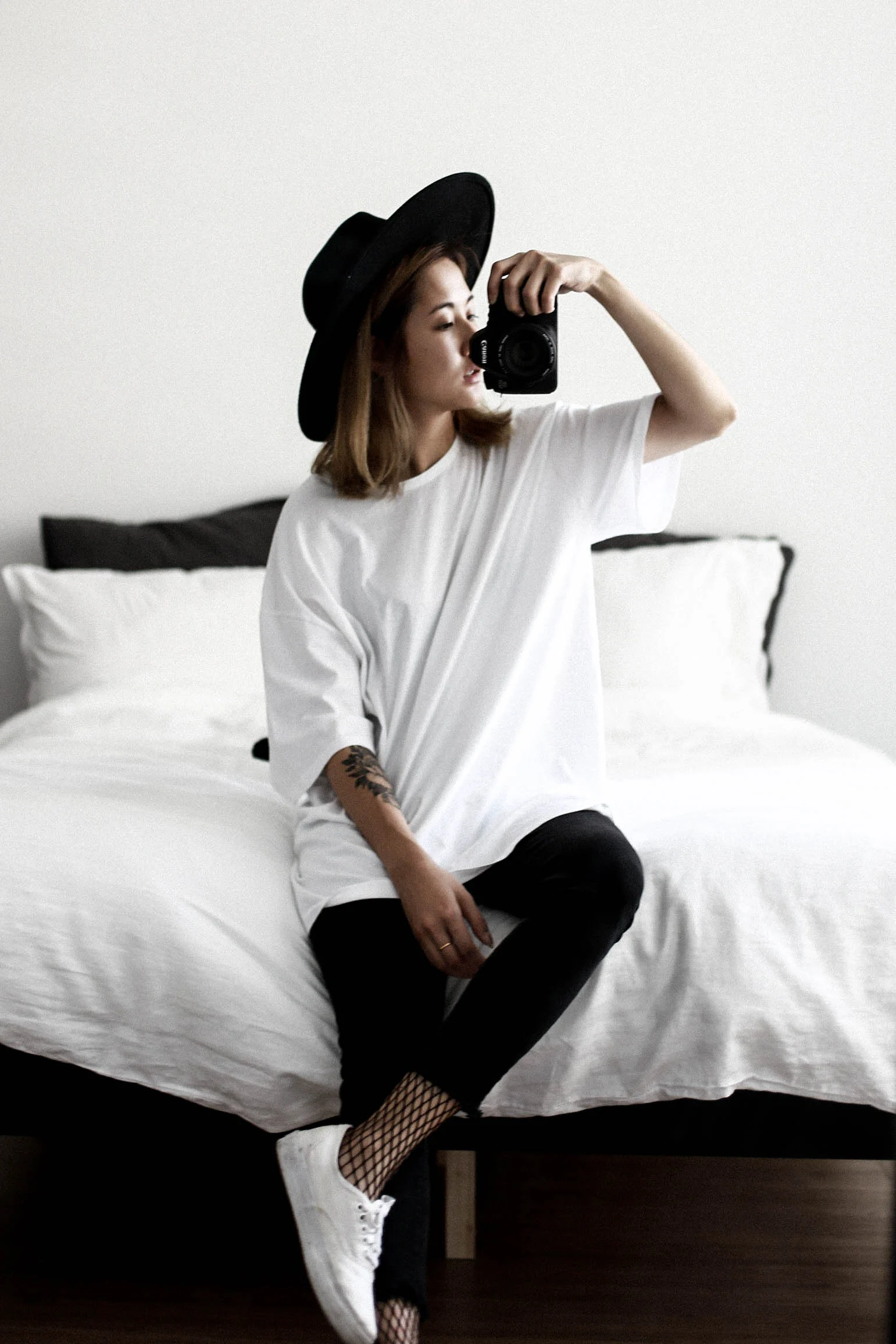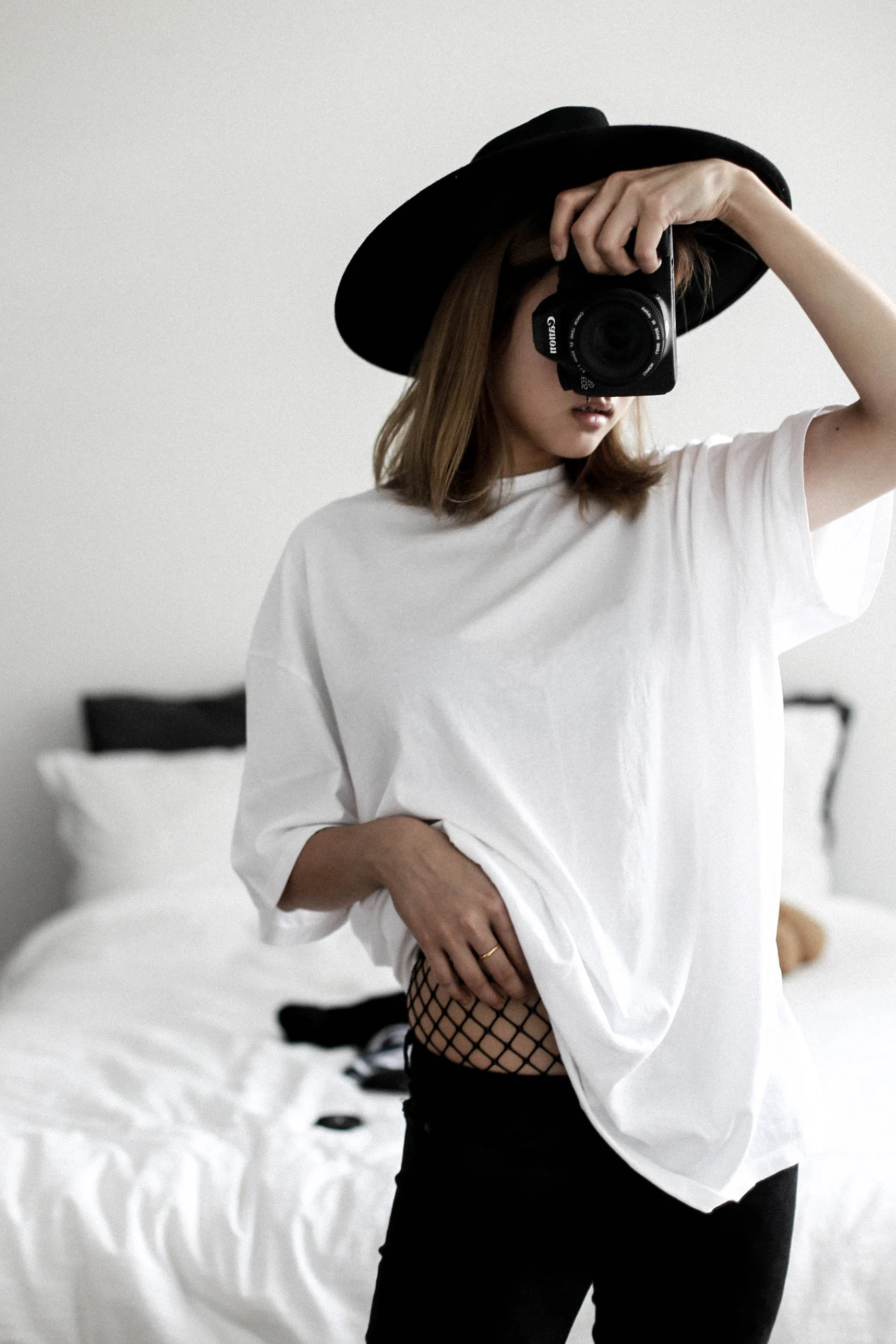 But this trend I can relate to my punk roots though. Yeah I used to wear ripped tights and fishnet tights at thirteen already. I think it's cool that they are making a comeback because I love seeing them mixed in high fashion or more minimal looks. So I definitely wanted to get a pair and see how it goes now that I'm 24. Just worn under my normal outfit, they definitely give my average daily outfit a little bit more kick. But I don't really see myself wearing them out on the street. I have become a very very casual person when it comes to dressing. These tights are that little extra effort. Actually I was supposed to take a proper shoot with Brian on the street today but when I figured that I don't feel like going out, I didn't want to bother to put make up on, so here we have another mirror outfit shoot. I hope you guys don't mind. I actually like my mirror.